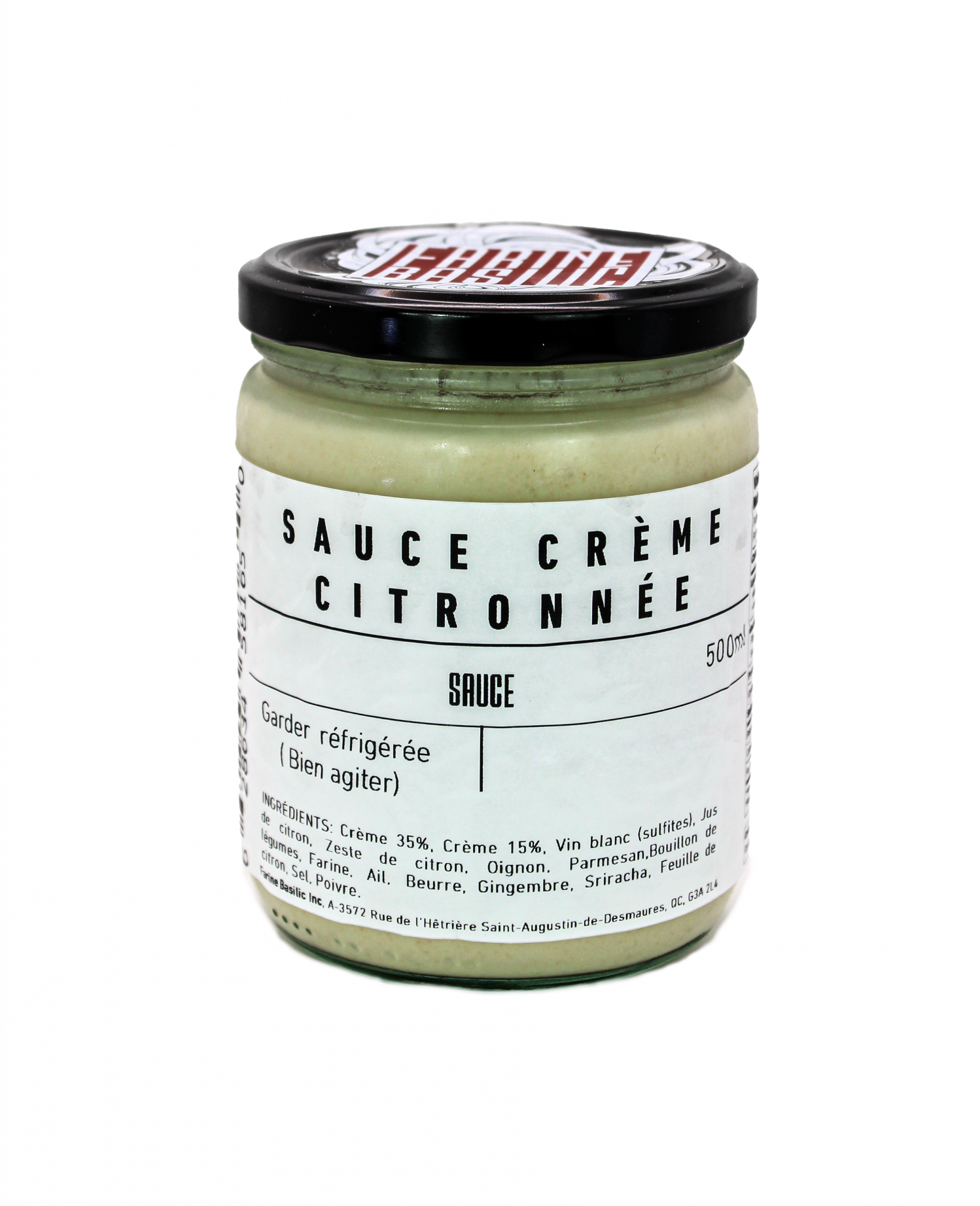 Crème 35%, Crème 15%, Vin blanc (sulfites), Jus de citron, Zeste de citron, Oignon, Parmesan, Ail, Beurre, Sel, Poivre.